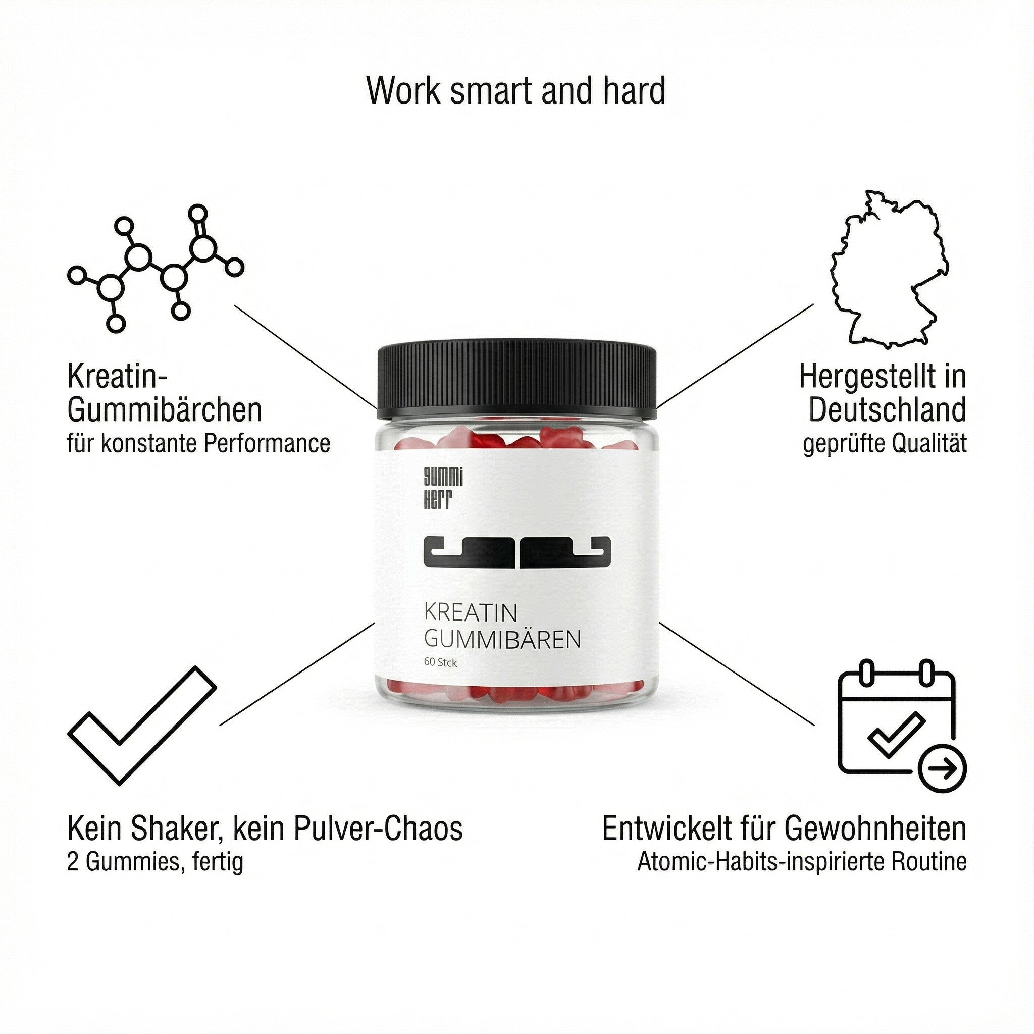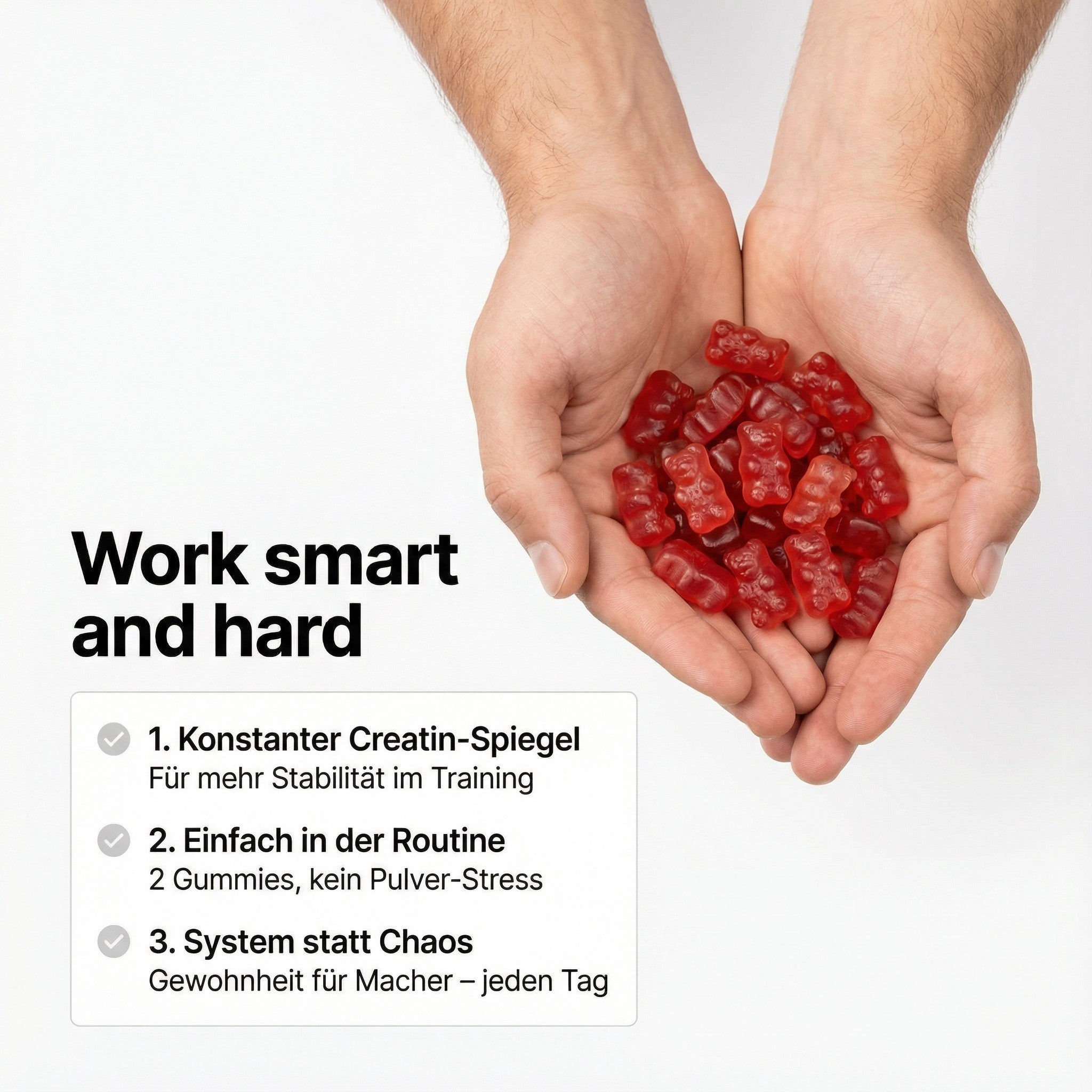 Was viele nicht wissen: Man muss bei Kreatin viel trinken. Mit den Gummies vergess ich das manchmal fast weil's so easy ist. Aber Wirkung top.